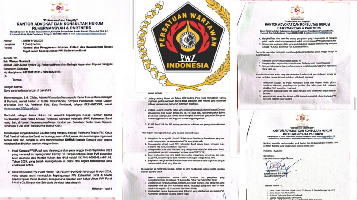 Somasi tersebut memberikan batas waktu hingga 19 Juli 2025 kepada Wawan Suwandi untuk menghentikan semua klaim dan tindakan mengatasnamakan PWI Kalbar, tidak lagi menggunakan atribut resmi organisasi, mencabut seluruh dokumen dan keputusan yang dikeluarkan secara illegal, menyampaikan klarifikasi dan permintaan maaf secara terbuka, mengembalikan seluruh dokumen dan atribut PWI yang telah disalahgunakan.