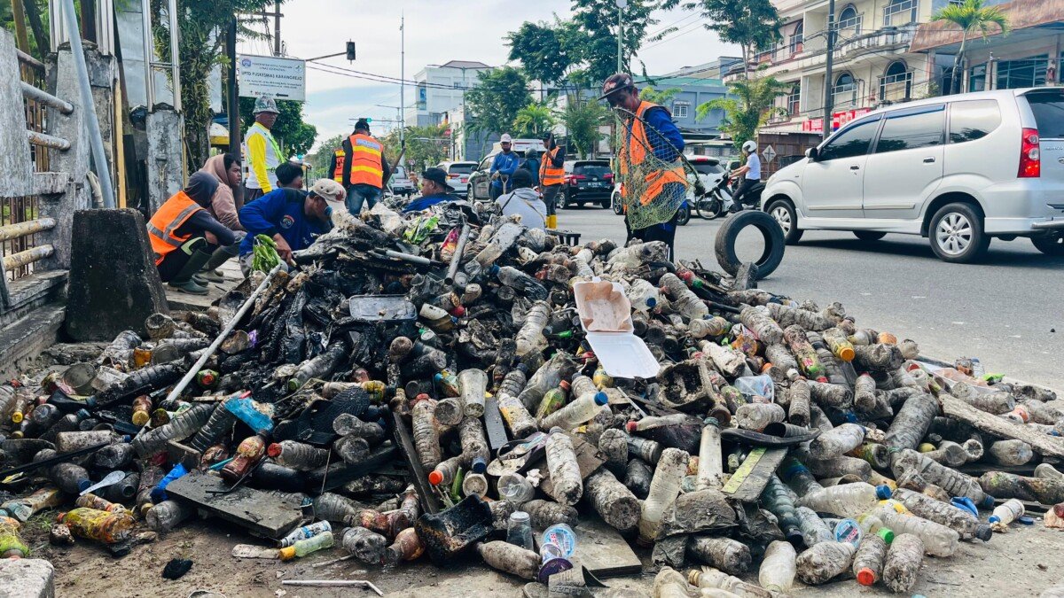 Pemandangan tidak biasa itu sontak menyita perhatian para pengguna jalan yang melintas. Di badan jalan, tampak menggunung botol-botol plastik yang baru saja diangkat. Sementara sejumlah petugas kebersihan terlihat kelelahan membersihkan sampah yang menutup aliran parit.
